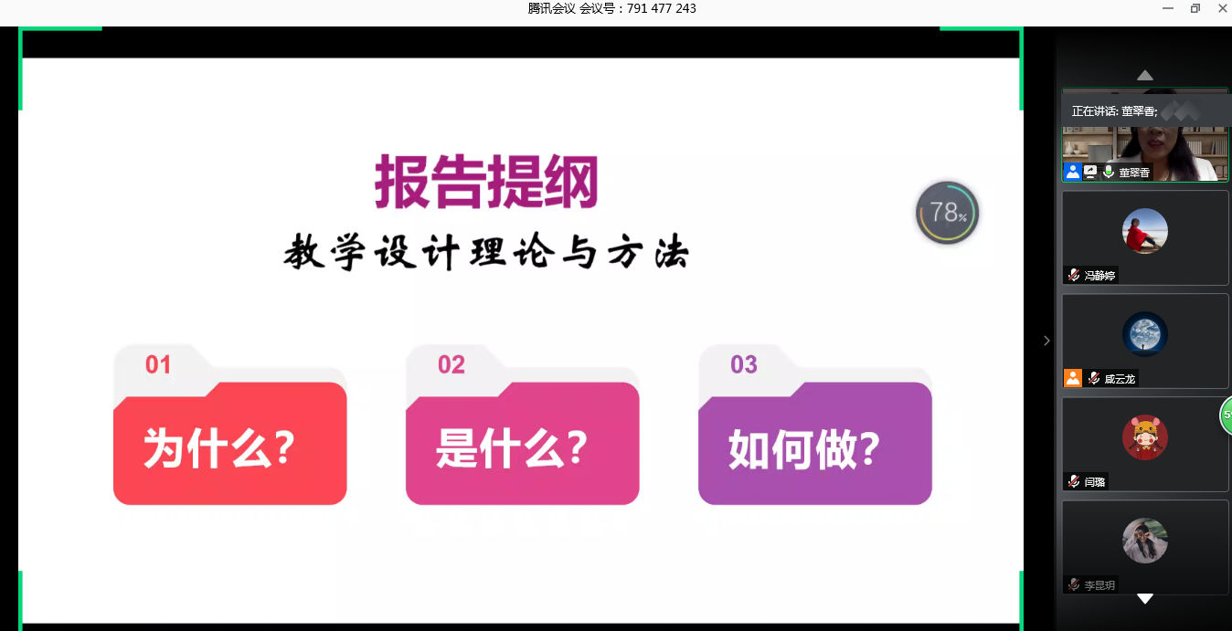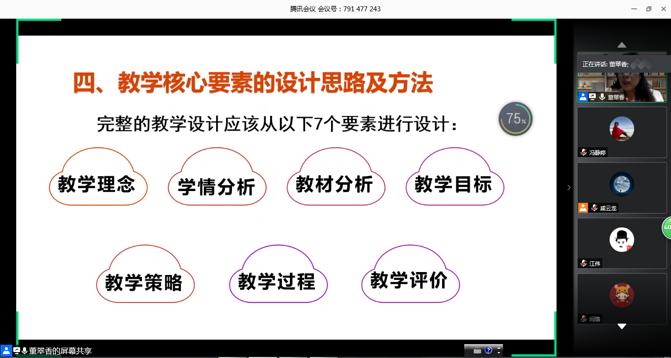 讲座中,董翠香教授从课程与教学的关系、课程目标与教学目标的关系入手,坚持问题导向,围绕为什么、是什么、 如何做三个方面就教学设计的概念、流程、依据、基本要素、目标要求等进行了解读。为帮助青年教师更好地做好教学设计,董教授结合案例从教学理念、学情分析、教材分析、教学目标、教学内容、教学策略、教学过程、教学评价等8个方面讲解了教学设计的基本要素。整场讲座内容丰富、思想新颖、见解独到。