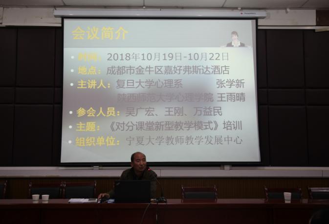 2018年10月19-22日,在永利集团教师发展中心的关心支持下,我院根据实际情况,选派基础理论教研室吴广宏、万益民、王刚3位教师前往成都参加了《对分课堂新型教学模式》学习培训。10月31日下午,77779193永利吴广宏教授代表学习小组,就此次学习培训的心得和收获同学院全体教师作了汇报交流。