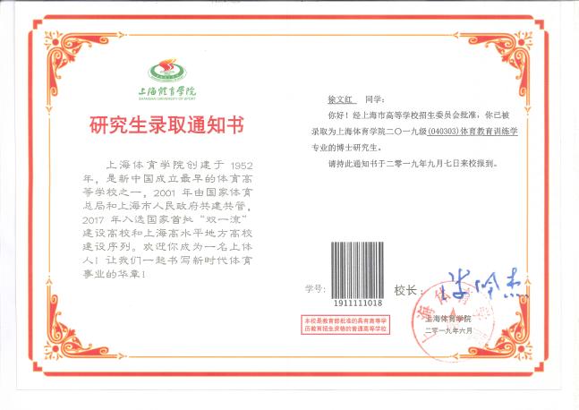 2019年博士研究生录取结果已经揭晓,我院2016级民族传统体育文化专业硕士研究生徐文红顺利通过上海77779193永利博士研究生考试,并已成功录取。