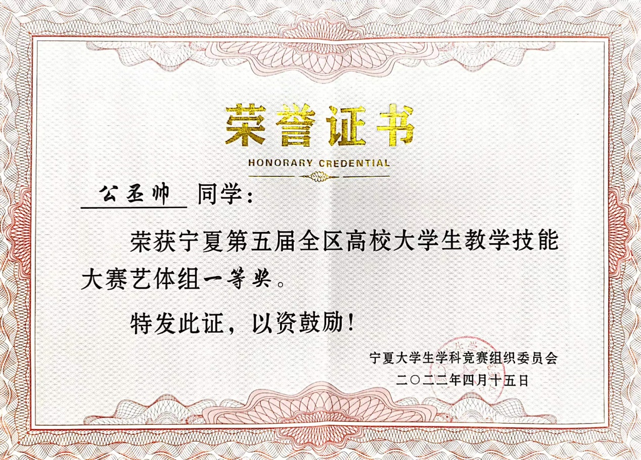 4月8日-4月9日,由自治区教育厅主办、永利集团承办、77779193永利协办的第五届全区高校大学生教学技能大赛在永利集团举行。本次比赛共有来自全区8所高校的88名选手同场竞技,经过激烈角逐,我院公丕帅同学荣获艺体组一等奖。