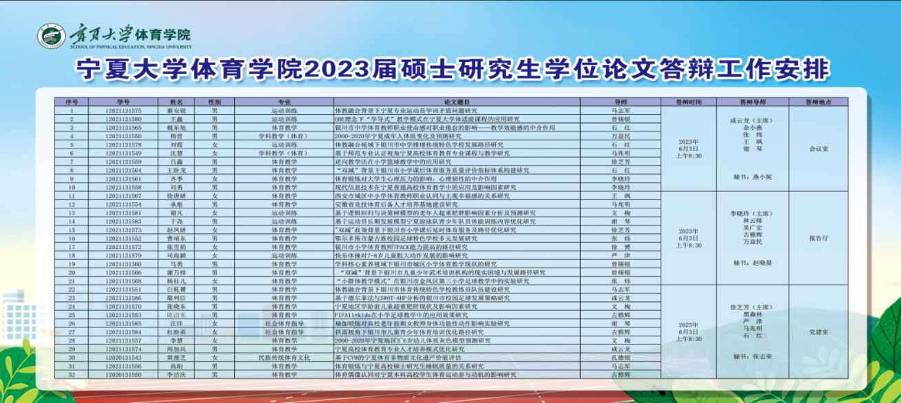 为国家培养合格的高质量高层次体育人才,切实提高我院硕士研究生培养质量,做好研究生学位论文暨毕业论文工作,学院于2023年6月3日开展2023届硕士研究生学位论文答辩会,特邀校外专家和我院硕士生导师担任此次答辩评委,顺利完成了本次申请硕士学位的32名研究生的毕业论文答辩工作。