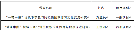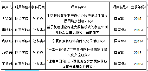 2018年,体育学共项目共立项175个,其中:重点项目12项、一般项目131项、青年项目17项、西部项目15项;分散于88所高校(单位)中。在所有这些高校(单位)中,获得6项的有1所高校(单位)、获得4项的有3所高校(单位)、获得3项的有9所高校(单位)、获得2项的有28所高校(单位)、获得1项的有47所高校。我院成为获得2项的28所高校(单位)之一。