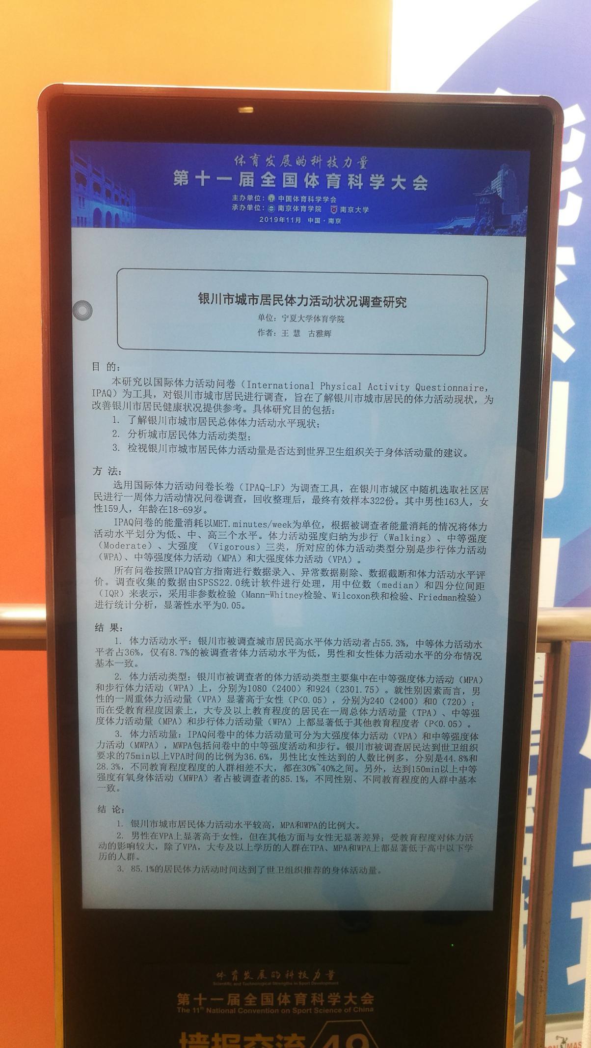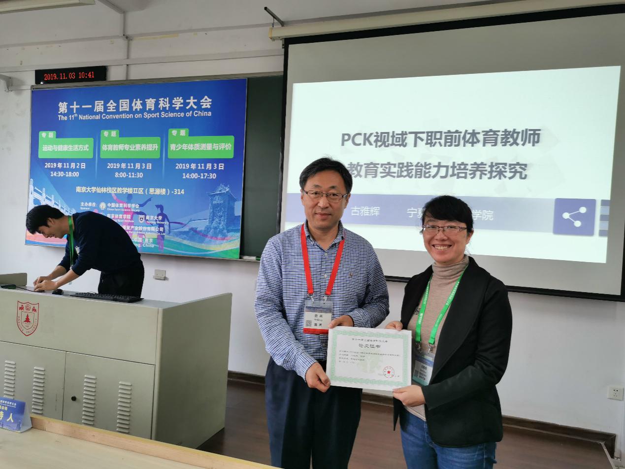我院古雅辉、朱培彰、咸云龙和王慧等四位教师的论文入围本届体育科学大会。其中古雅辉的《PCK视域下职前体育教师教育实践能力培养研究》、朱培彰的《文化学视域下体育新课程教学的困惑及纾解路径》和咸云龙的《宁夏回族传统体育口述史研究》进行了专题报告,王慧的《银川市城市居民体力活动状况调查研究》进行了墙报交流,这是我院自参加体育科学大会以来,取得的最好成绩!