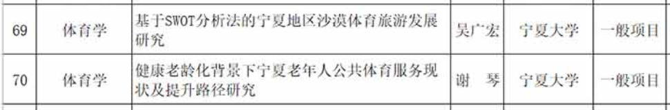 宁夏社科规划办公布了2021年宁夏哲学社会科学规划年度项目立项名单,我院吴广宏教授申报的《基于SWOT分析法的宁夏地区沙漠体育旅游发展研究》和谢琴副教授申报的《健康老龄化背景下宁夏老年人公共体育服务现状及提升路径研究》喜获项目立项。
