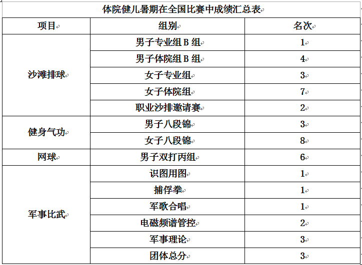 我校沙排代表队的队员们发挥勇于拼搏的精神,最终麻孟纯、陈文浩组合获得男子专业组B组第一;姚鹏、郑楷涵组合获得男子体院组B组第四;庞姗姗、黄孟莉组合获得女子专业组第三名;宋艳、刘新月组合获得女子体院组第七名的优异成绩。