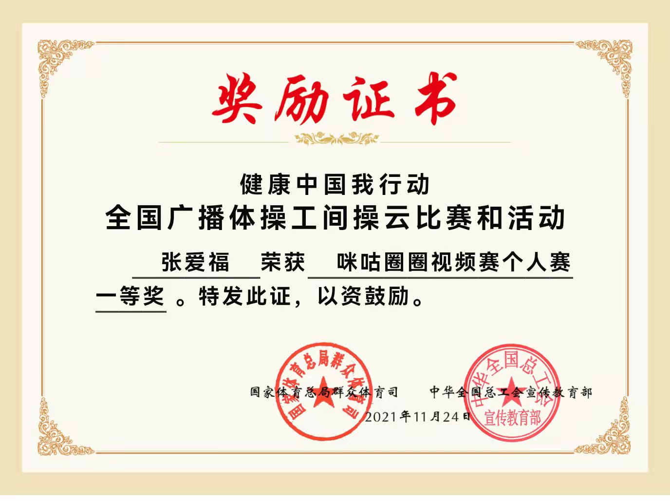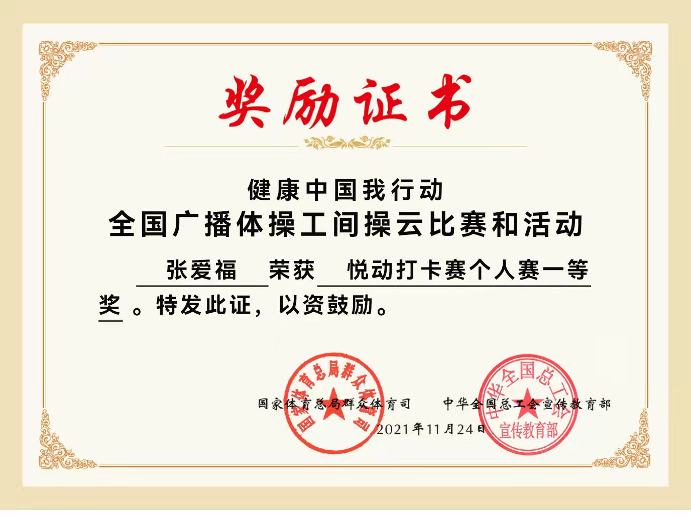 日前,由国家体育总局群众体育司和中华全国总工会宣传教育部联合主办的“健康中国我行动”全国广播体操工间操云比赛和活动落下帷幕,经过“悦动训练营”、“线上视频赛”和“全国评选及展演”三个阶段,历时8个月的比拼,11月24日,组委会正式颁发比赛获奖证书。我院青年教师张爱福荣获“悦动打卡赛个人赛一等奖”、“咪咕圈圈视频赛个人赛一等奖” 。