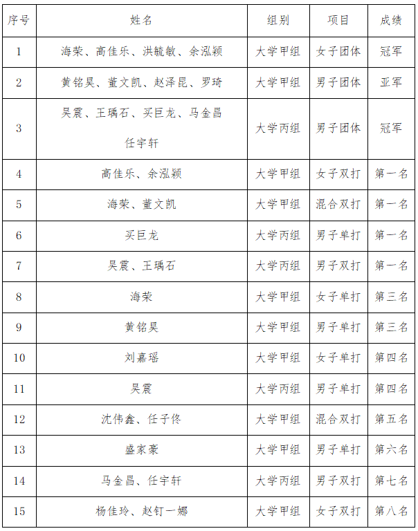 经过5天激烈的角逐,我校学子共获得15项奖项,其中大学甲组女子团体和大学丙组男子团体均获得冠军、大学甲组男子团体获得亚军,在单项比赛中,高佳乐等同学共获得四项第一名和其他多项名次的优异成绩。