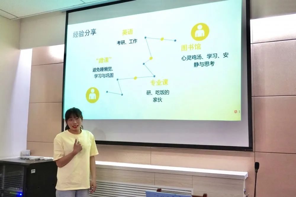 随后,保研、考研的同学们进行了经验的分享交流。高阳同学从确定目标、复习备考、学习习惯、心理状态等多方面与同学们进行经验交流。徐夏欣同学从保研角度为大家带来她的经验分享。张珠文同学从英语重要性、学习知识的深度与广度、专业知识的学习等方面与同学们交流了保研的过程,并鼓励大家树立自信、坚定目标。司海颖同学从择校以及各个科目的学习为大家分享了考研经验。陈沼东同学从持之以恒、孰能生巧、勤学好问、张弛有度等多个方面为大家分享考研经验。谢凡同学从目标选择、英语题型、专业学习等多方面分享了自己的考研经验。晁伟伟同学从坚定初心、不甘平庸、虚心学习等方面为同学们带来鼓励。马勇同学从择校的重要性,报考方向的选择的等多方面讲解了考研经验。张杨子钰同学主要从英语学习、生活习惯、日常交际等方面介绍了自己的考研经验。最后,马晓娜老师发表了总结讲话,宣布本次交流会的圆满结束。