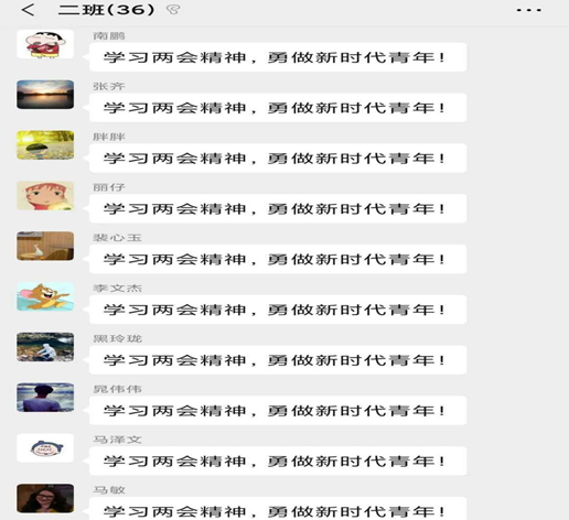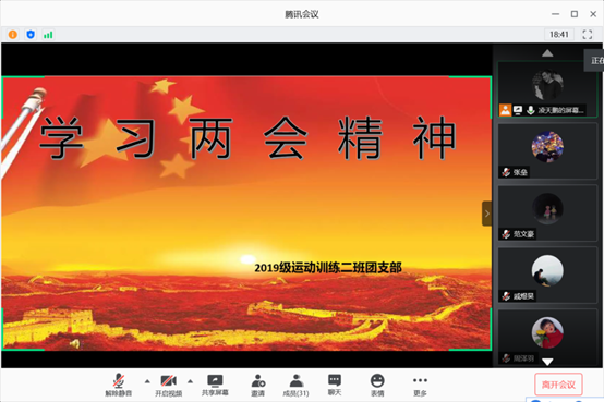 (1)团支部书记徐志红同学组织班级团支部成员通过共享屏幕集体观看两会视频资料。
