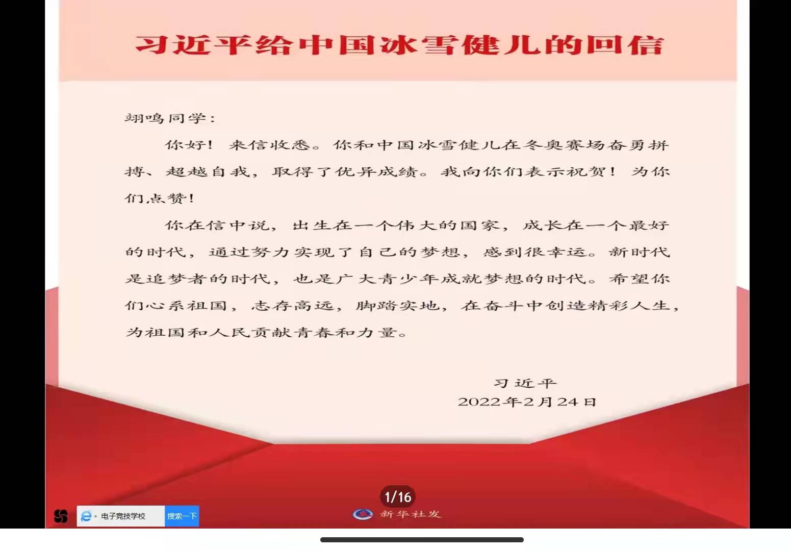 为全面贯彻落实“习近平总书记给中国冰雪健儿重要回信”精神,3月21日,我团支部以线上会议的形式开展学习“习近平总书记给冰雪健儿的重要回信”精神为主题的团日活动,团支部全体成员参加,活动由团支部书记肖彤同学主持。