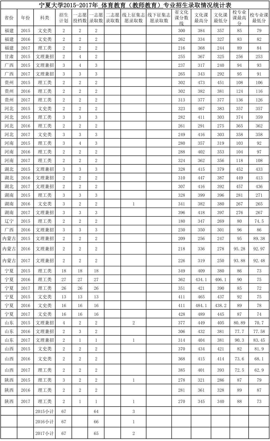 永利集团2015-2017年 体育教育(教师教育)专业招生录取情况统计表