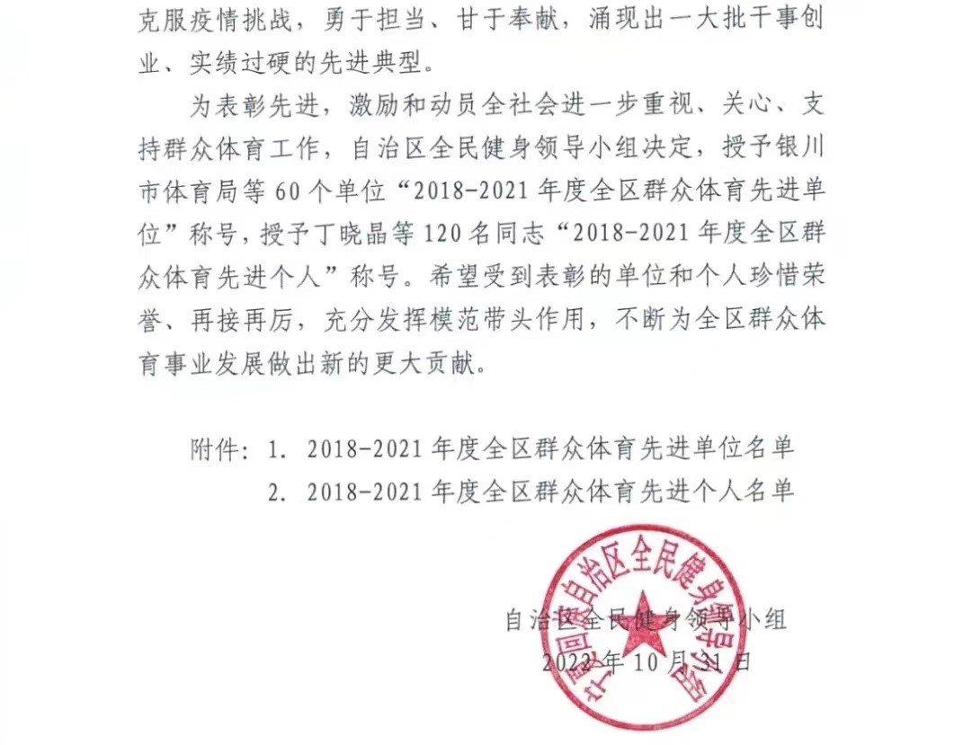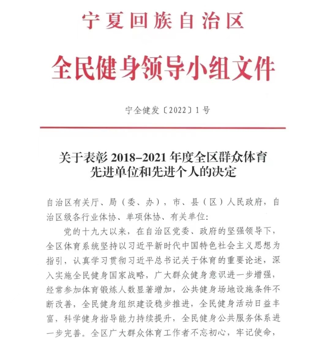 近日,宁夏回族自治区全民健身领导小组下发《关于表彰2018-2021年度全区群众体育先进单位和先进个人的决定》(宁全健发[2022]1号),77779193永利被授予“2018-2021年度全区群众体育先进单位”称号。