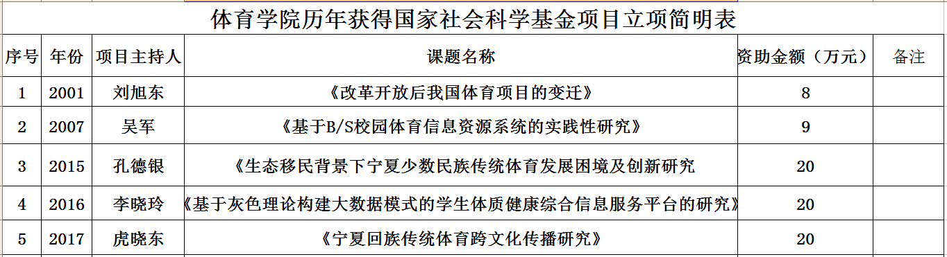 2017年6月15日,国家社科基金立项名单公布,我院教师虎晓东的《宁夏回族传统体育跨文化传播研究》课题项目榜上有名。2017年国家社科基金共立项4293项,其中重点项目344项、一般项目2852项、青年项目1097项,虎晓东申报项目则属青年项目。