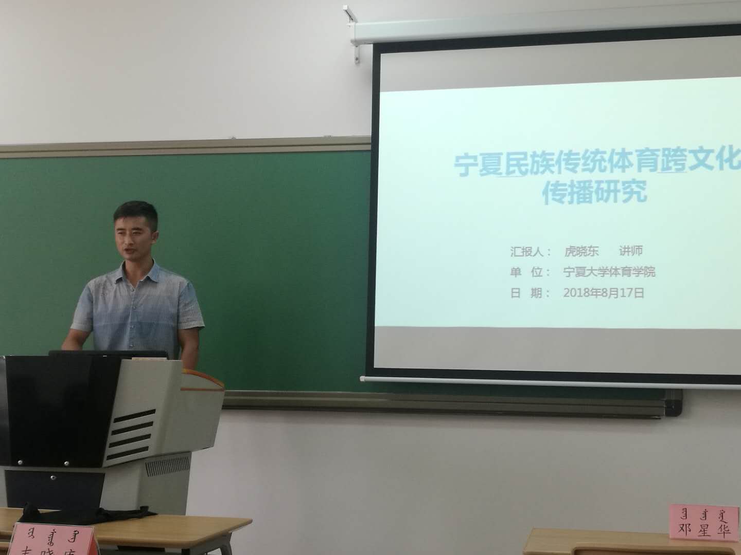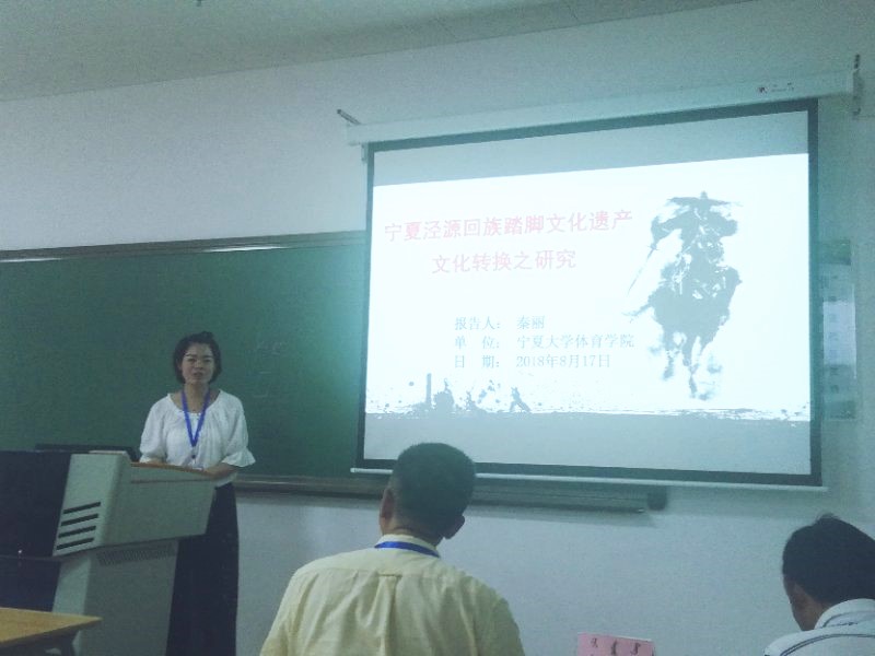 会上,虎晓东老师以《宁夏民族传统体育跨文化传播研究》为报告题目,立足宁夏民族传统体育实际,借助文化空间的研究视角,对宁夏民族传统体育跨文化传播的表现形式和路劲模式进行了详细分析。同时,运用体育人类学相关理论方法探索了文化的“输入”与“输出”在宁夏民族传统体育跨文化传播中的历史意义和现实价值。秦丽老师遵循体育文化史发展的逻辑,以《宁夏泾源回族踏脚文化遗产文化转换之研究》为题,分别从历史背景、社会场域、生产生活、文化再生产等角度入手,对宁夏泾源回族踏脚文化的历史转换原因、形式及其文化隐喻等进行了研究,并作专题汇报。