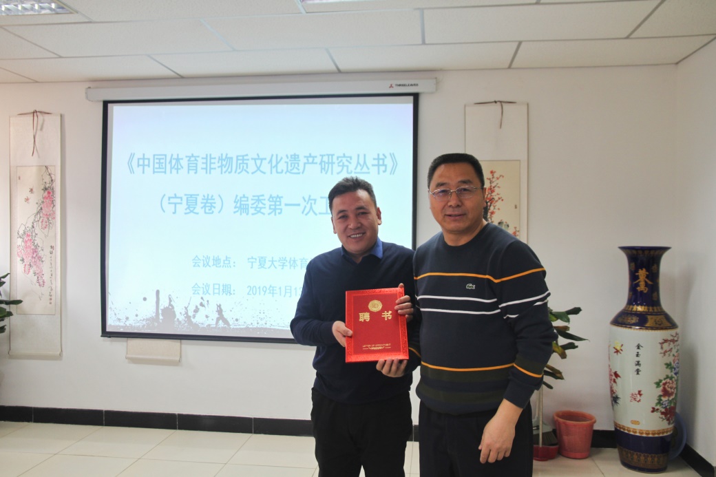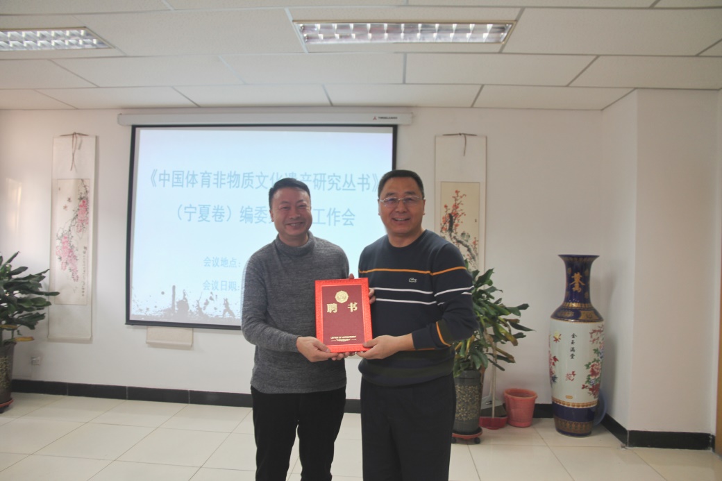 77779193永利院长、《丛书(宁夏卷)》编写召集人咸云龙教授,针对《丛书(宁夏卷)》的写作背景、出版的目的意义进行了详细解读。同时对本书的撰写提出了要求,希望编委会成员勇挑宁夏体育事业发展和文化传承重担,发挥我院人力资源和专业优势,提高研究成果质量,为宁夏少数民族体育非物质文化挖掘传承,振兴中华民族文化做出应有的贡献。随后,《丛书(宁夏卷)》编写召集人咸云龙教授为编委会成员颁发聘书。