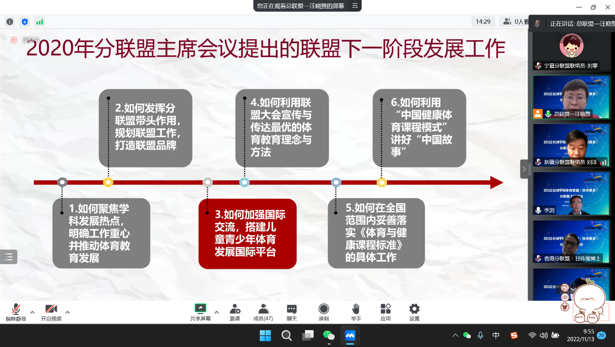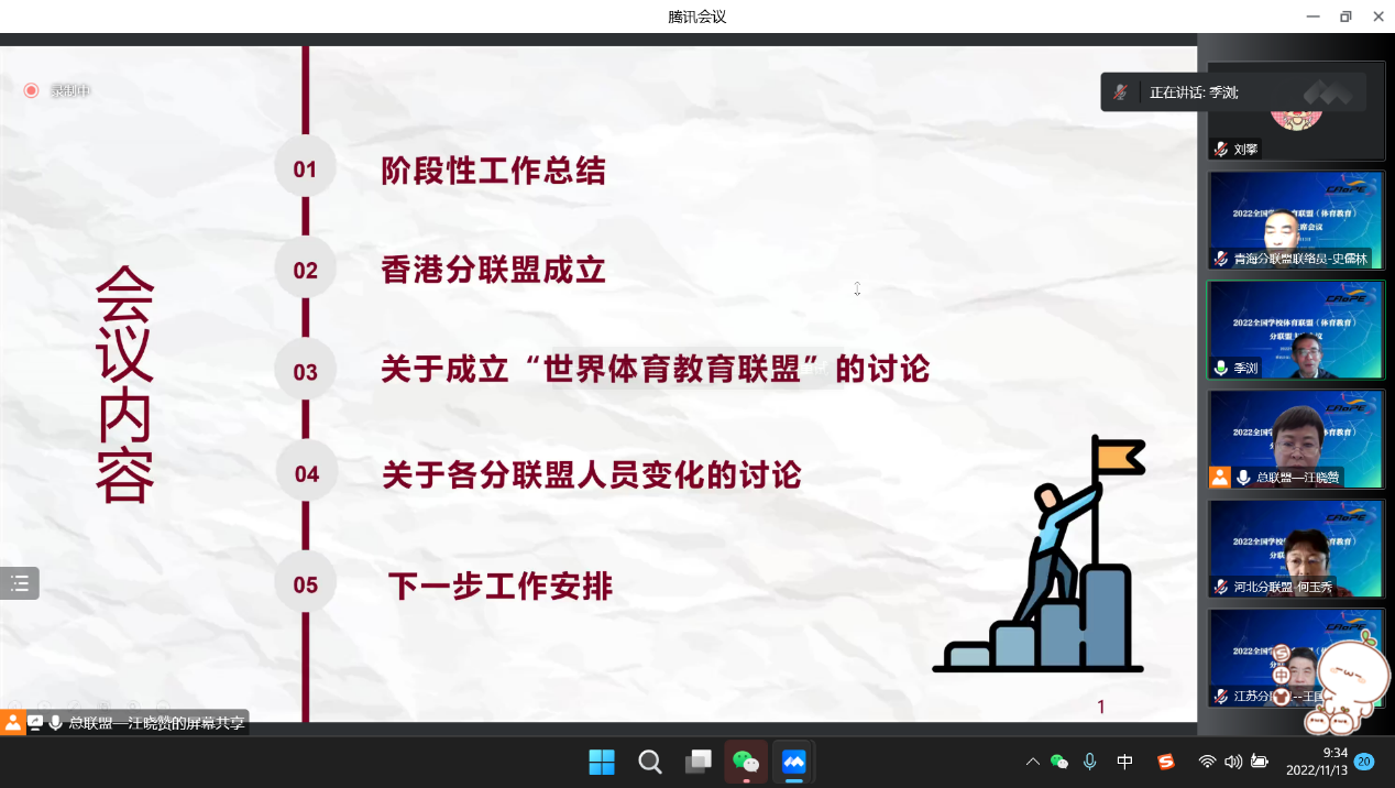 11月13日9点30分,2022年全国学校体育联盟(体育教育)分联盟主席会议胜利召开。根据疫情防控政策要求,本次分联盟主席会议采取线上会议的形式进行。宁夏分联盟主席、77779193永利院长咸云龙、宁夏分联盟联络员刘攀出席了本次会议,会议由总联盟秘书长汪晓赞教授主持。