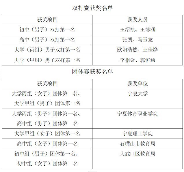 闭幕式现场气氛极为热烈,参赛团队和个人凭借不懈努力与辛勤汗水,赢得了荣誉。其中,永利集团代表队表现突出,在单打赛中,我校刘潇阳荣获大学(丙组)男子个人赛第一名,宫翌航荣获大学(丙组)女子个人赛第一名。在混双赛中,刘潇阳、宫翌航荣获大学(丙组)混双第一名。在团体赛中,永利集团荣获大学丙组(女子)团体第一名、大学甲组(男子)团体第一名。郭念、段鑫、钟海婷、陶然荣获“优秀裁判员”称号,王刚等15人荣获“优秀教练员”称号,马斌等16人荣获“优秀运动员”称号。永利集团、银川能源学院、石嘴山市教育局、惠农区教育局荣获道德风尚奖。(具体名单附后)
