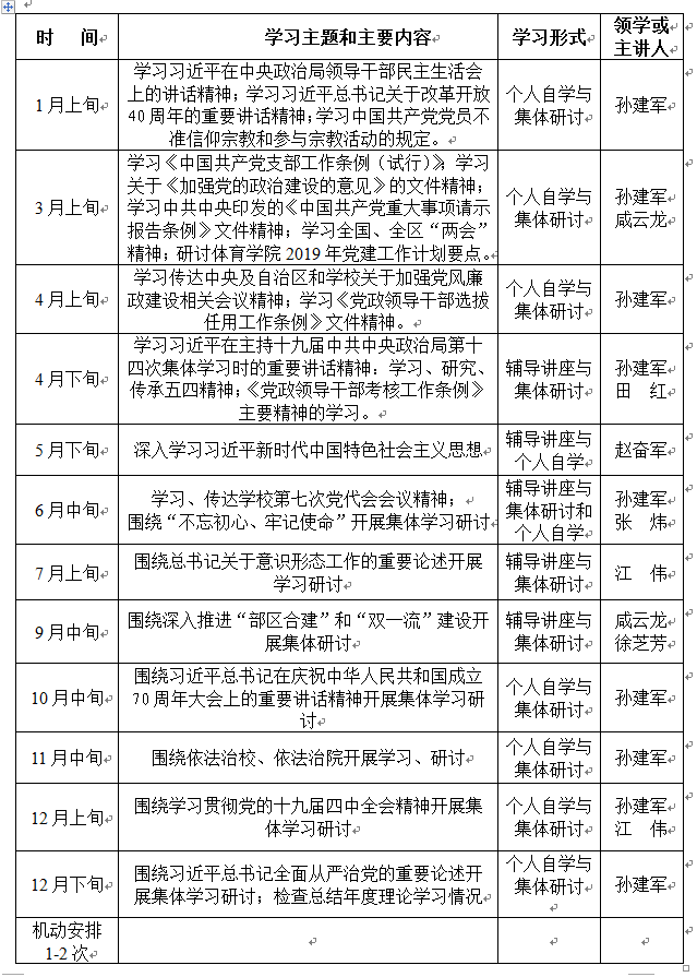 特别说明:根据学校工作安排,以上为学院中心组2019年的理论学习安排,请各中心组成员认真执行,每次的主讲人或领学人必须提前备课并准备好相关学习材料。学院周三教职工、党支部、各班级的政治理论学习应结合工作实际,参照本安排计划执行。