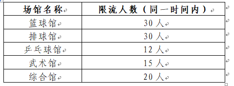 室内场馆严格实行限流政策(具体限流人数见下表),超过限定人流量则实行“出一进一”管理。室外场地不进行人流限制。