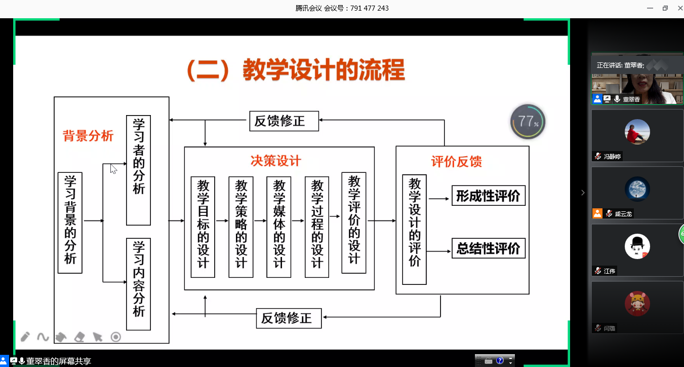 讲座中,董翠香教授从课程与教学的关系、课程目标与教学目标的关系入手,坚持问题导向,围绕为什么、是什么、 如何做三个方面就教学设计的概念、流程、依据、基本要素、目标要求等进行了解读。为帮助青年教师更好地做好教学设计,董教授结合案例从教学理念、学情分析、教材分析、教学目标、教学内容、教学策略、教学过程、教学评价等8个方面讲解了教学设计的基本要素。整场讲座内容丰富、思想新颖、见解独到。