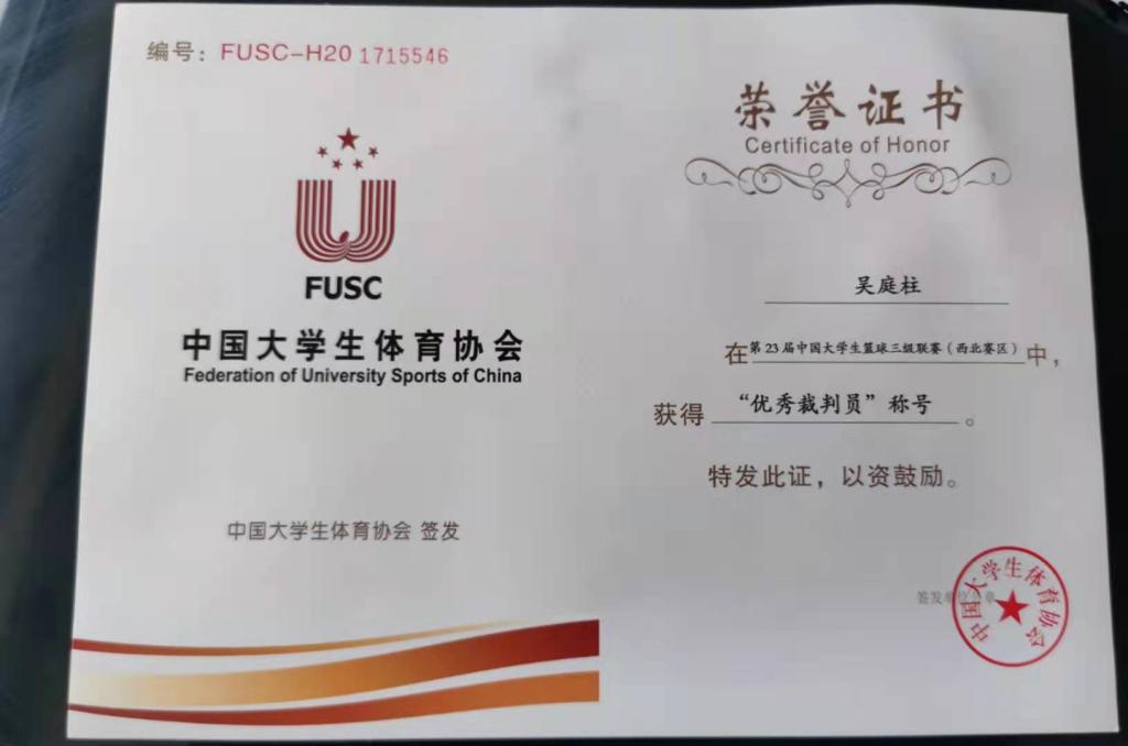 2021年5月21日-26日,第23届中国大学生篮球三级联赛(西北赛区)的比赛在呼和浩特职业学院举行。我院青年教师、篮球国家级裁判吴庭柱老师被选调担任本次比赛的裁判任务,在赛会期间作为主裁判承担第一阶段到决赛阶段的全过程裁判工作,被评选为“优秀裁判员”。