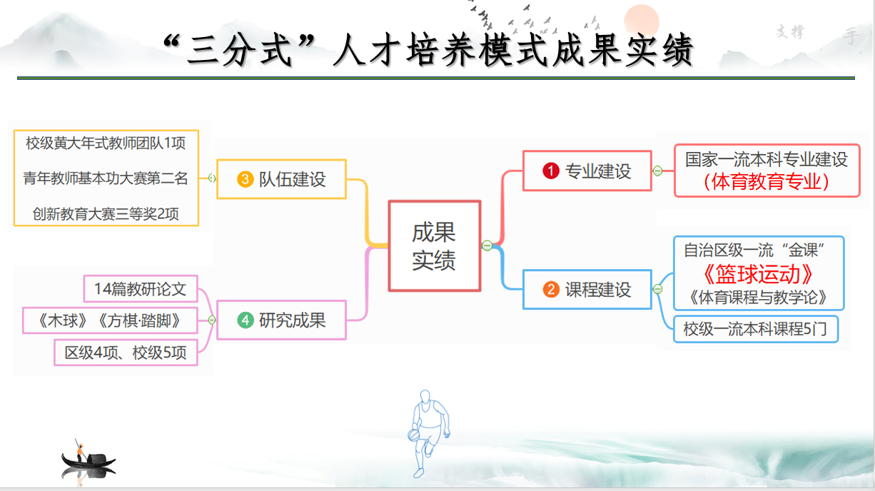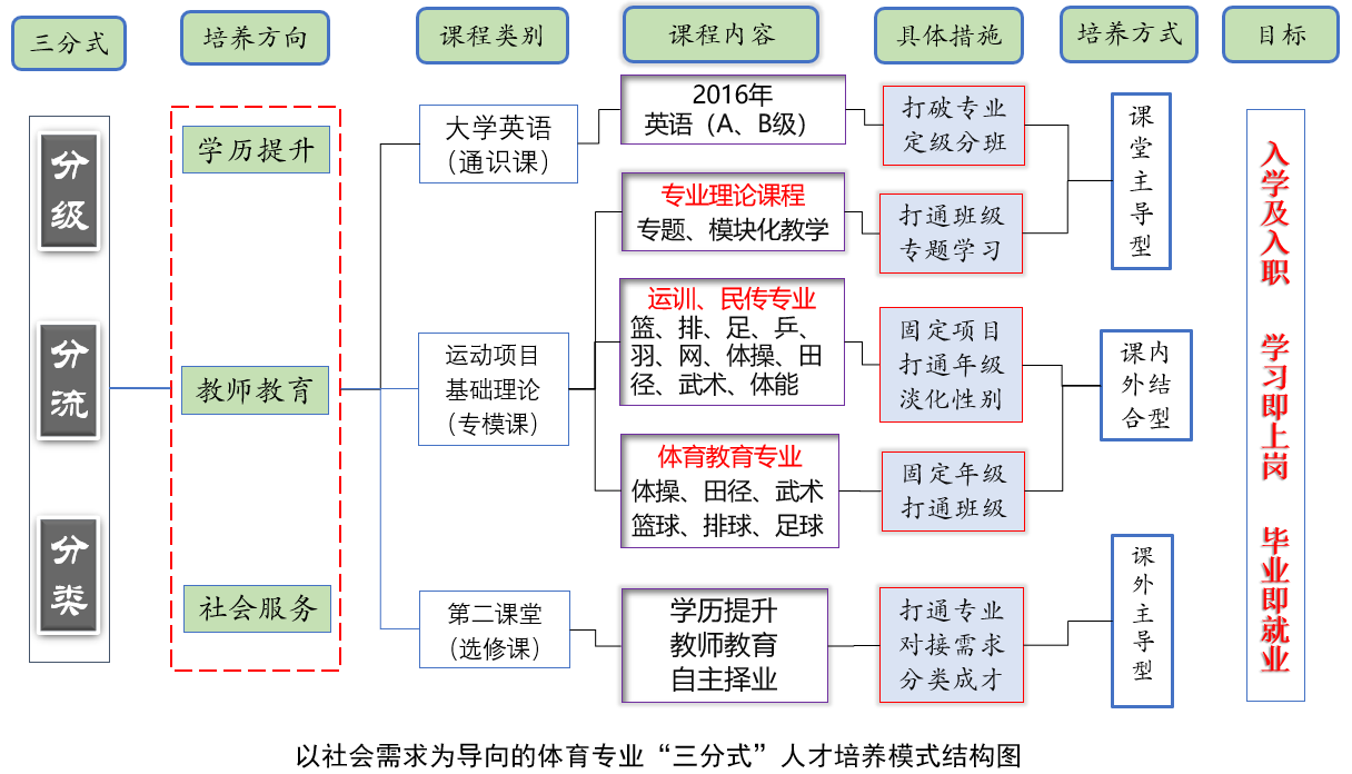 该成果立足社会需求、学生基础、兴趣和个性发展,构建了大学英语分级教学、运动项目分流培养、学生成才分类发展的“三分式”人才培养模式,有效助推了学生忙起来,教师强起来,效果实起来,学生就业率(排名学校第一)、升学率不断提高。