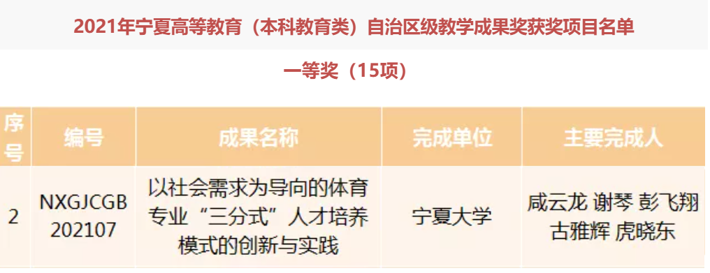 2021年12月30日,自治区教育厅公布了2021年高等教育自治区级教学成果奖名单,我院咸云龙教学团队(谢琴、彭飞翔、古雅辉、虎晓东、马绮龙、徐芝芳、张炜)主持申报的《以社会需求为导向的体育专业“三分式”人才培养模式的创新与实践》荣获2021年宁夏高等教育(本科教育类)自治区级教学成果一等奖。