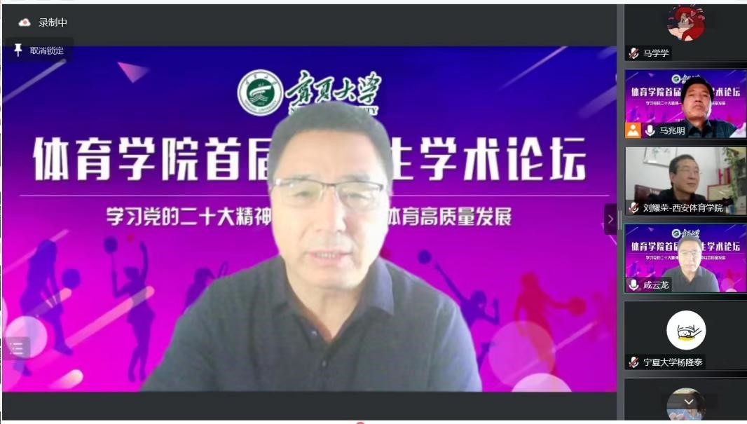 咸云龙在致辞中表示,为贯彻党的二十大精神,为国家培养合格的高层次体育人才,提高我院研究生培养质量,聚焦宁夏体育事业发展,开启永利集团体育学研究生首届学术论坛具有特殊意义。我谨代表77779193永利党政领导、全院师生向全国各著名院校的知名专家的学术盛宴表示感谢,祝参会的各位老师和研究生同学们通过本次学术论坛的交流学习有所收获,为我院研究生教育质量提高、乃至宁夏体育事业的发展做出永利集团贡献!